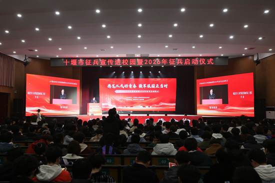本网讯(文张华/图 李一凡)12月25日下午,由十堰市人民政府征兵办公室主办、我校承办的以“携笔从戎砺青春,强军报国正当时”为主题的十堰市征兵宣传进校园暨2026年征兵启动仪式在学校大礼堂举行。